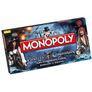 A pirate adventure awaits you in this special Pirates of the Caribbean collectors edition of the Monopoly game featuring prominent locations from the new movie, On Stranger Tides. Do you have what it takes to outwit and outlast the legendary Pirates of the Caribbean as you buy,sell and trade pirates destinations in the movie including El Lagarto Ridge, White Cap Bay, the Blue Cave and the deadly Mermaid Pools? The fate ofthe high seas lies in your hands as you battle for the ultimate control of the Fountain of Youth.