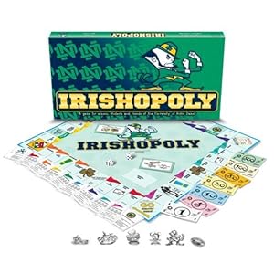 The IRISHOPOLY board game is perfect for Notre Dame Alumni, students and future grads. Tokens include fighting Irishman, football, shamrock, alarm clock, and bicycle. Board spaces include the golden dome, Notre dame stadium, law school, fighting Irish band, the huddle, St. Michael’s laundry, and St. Joseph’s lake.