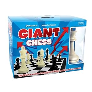 Pressman Giant Garden Chess Set. Checkmate the king in this giant set to win. Set contains plastic pieces measuring 4 to 8 inches tall and a 3-foot square mat. For 2 players, ages 8 and up.